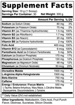Ingredients: Sodium (as Sodium Citrate), Potassium (as Potassium Citrate), Vitamin B1 (as Thiamine Hydrochloride), Vitamin B2 (as Riboflavin), Vitamin B3 (as Niacin), Vitamin B6 (as Pyridoxine Hydrochloride), Folic Acid, Vitamin B12 (as Cyanocobalamin), Pantothenic Acid (as D-Calcium Pantothenate), Calcium (as Dicalcium Phosphate), Phosphorous (as Dicalcium Phosphate), Magnesium (as Magnesium Oxide), Chromium (as Chromium Nicotinate), Dicreatine Malate, L-Arginine Alpha Ketoglutarate, Beta Alanine, Caffeine, Energy/Endurance/Focus Matrix (L-Taurine, Betaine Anhydrous, Waxy Maize, L-Citrulline Malate, Glycocyamine, Glucuronolactone, L-Tyrosine, Maltodextrin, Citric Acid, Dextrose, Sucralose, Silicon Dioxide.